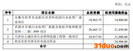 2021年11月23日,创业环保发布2021年度非公开发行A股股票预案。本次非公开发行募集资金金额为不超过8.31亿元(含本数),扣除发行费用后拟用于安徽阜阳界首高新区田营科技园污水处理厂建设项目、洪湖市乡镇污水处理厂新建及提标升级和配套管网(二期)PPP项目、天津市主城区再生水管网连通工程第一批项目、偿还有息负债及补充流动资金。