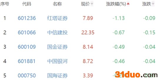 红塔证券、中信建投、国金证券、中国银河和国海证券位列板块涨幅榜后五位,涨幅分别为-1.13%、-0.67%、-0.49%、-0.46%和-0.29%。