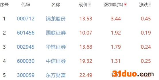 其中,锦龙股份、国联证券、华林证券、中信证券和东方财富位列板块涨幅榜前五位,涨幅分别为3.44%、1.92%、1.79%、1.31%和1.03%。