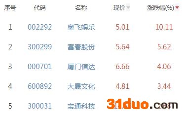 其中,奥飞娱乐、富春股份、厦门信达、大晟文化、宝通科技位列板块涨幅前五位,涨幅分别为10.11%、5.62%、4.06%、3.44%、2.68%。