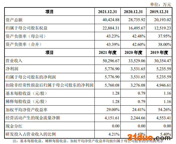 2019年至2021年,普蕊斯的营业收入分别为30,354.47万元、33,529.06万元、50,296.67万元;净利润分别为5235.59万元、3531.65万元、5776.90万元;扣除非经常性损益后归属于母公司股东的净利润分别为4946.61万元、3276.08万元、5760.08万元;经营活动产生的现金流量净额分别为4553.41万元、2244.66万元、4151.61万元。