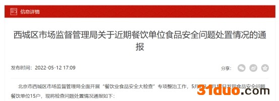 中国经济网北京5月17日讯 近日,西城区市场监督管理局发布关于近期餐饮单位食品安全问题处置情况的通报。北京市西城区市场监督管理局全面开展“餐饮业食品安全大检查”专项整治工作,5月1日-5月12日发现食品安全问题餐饮单位15户。