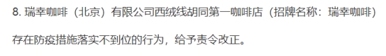 其中,瑞幸咖啡(北京)有限公司西绒线胡同第一咖啡店(招牌名称:瑞幸咖啡)存在防疫措施落实不到位的行为,给予责令改正。