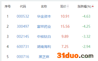 华金资本、富祥药业、中核钛白、海南海利、黑芝麻位列涨幅榜后五位,涨幅分别为-4.63%、-4.25%、-3.32%、-2.94%、-2.58%。