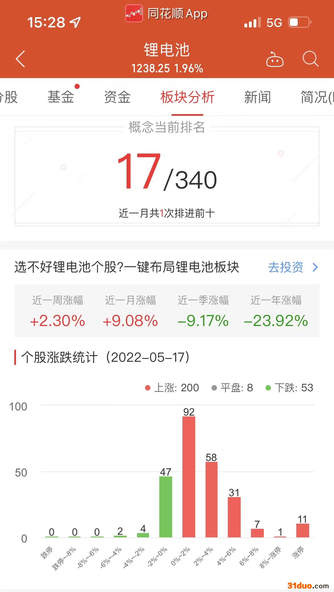 中国经济网北京5月17日讯 今日,锂电池板块整体涨幅1.96%,其中200只股票上涨,8只股票平盘,53只股票下跌。