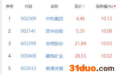 其中,中利集团、贤丰控股、吉翔股份、藏格矿业、索通发展位列板块涨幅前五位,涨幅分别为10.12%、10.08%、10.03%、10.02%、10.02%。