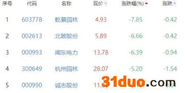 乾景园林、北玻股份、闽东电力、杭州园林、诚志股份位列涨幅榜后五位,涨幅分别为-7.85%、-6.66%、-6.39%、-5.20%和-5.10%。