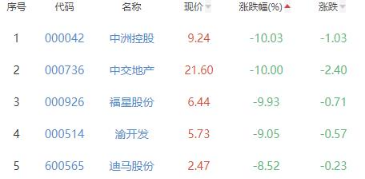 中洲控股、中交地产、福星股份、渝开发、迪马股份位列涨幅榜后五位,涨幅分别为-10.03%、-10.00%、-9.93%、-9.05%和-8.52%。