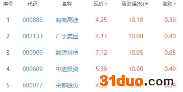 其中,海南高速、广宇集团、数源科技、中迪投资、宋都股份位列板块涨幅前五位,涨幅分别为10.10%、10.08%、10.05%、10.00%和9.90%。