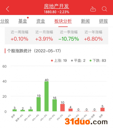 中国经济网北京5月17日讯 今日,房地产开发板块整体跌幅2.23%,其中19只股票上涨,2只股票平盘,83只股票下跌。