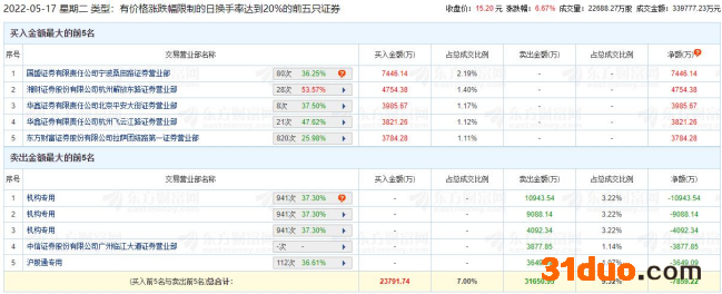 中国经济网北京5月17日讯祁连山(600720.SH)今日股价上涨,截至收盘报15.20元,涨幅6.67%。龙虎榜数据显示,卖出祁连山金额最大的