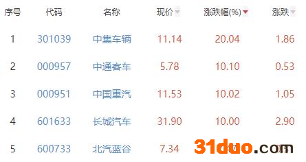 其中,中集车辆、中通客车、中国重汽、长城汽车、北汽蓝谷位列板块涨幅前五位,涨幅分别为20.04%、10.10%、10.02%、10.00%、7.47%。