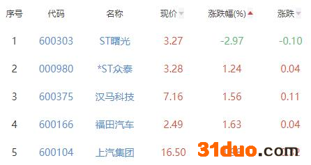 ST曙光、*ST众泰、汉马科技、福田汽车、上汽集团位列涨幅榜后五位,涨幅分别为-2.97%、1.24%、1.56%、1.63%、1.98%。