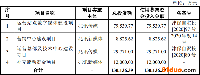 兆讯传媒发行募集资金总额为19.94亿元,扣除发行费用后,募集资金净额为19.04亿元。兆讯传媒最终募集资金净额比原计划多6.03亿元。公司于2022年3月17日披露的招股说明书显示,兆讯传媒拟募集资金13.01亿元,分别用于运营站点数字媒体建设项目、营销中心建设项目、运营总部及技术中心建设项目、补充流动资金项目。