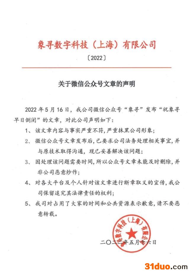 中新经纬5月17日电 17日凌晨,“象寻”微信公众号发布声明称,16日微信公众号发布“祝象寻早日倒闭”的文章与事实严重不符,严重抹黑公司形象。