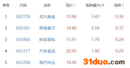 其中,龙大美食、青海春天、桃李面包、天味食品、海天味业位列板块涨幅前五位,涨幅分别为3.43%、2.56%、1.76%、1.40%、1.39%。
