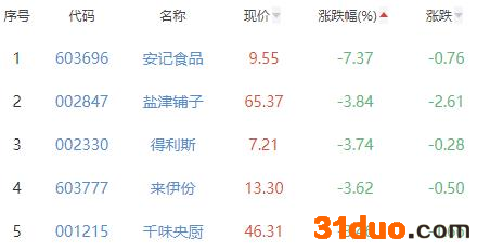 安记食品、盐津铺子、得利斯、来伊份、千味央厨位列涨幅榜后五位,涨幅分别为-7.37%、-3.84%、-3.74%、-3.62%、-3.46%。