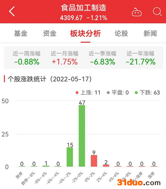 中国经济网北京5月17日讯 今日,食品加工制造板块整体跌幅1.21%,其中,11只股票上涨,63只股票下跌。