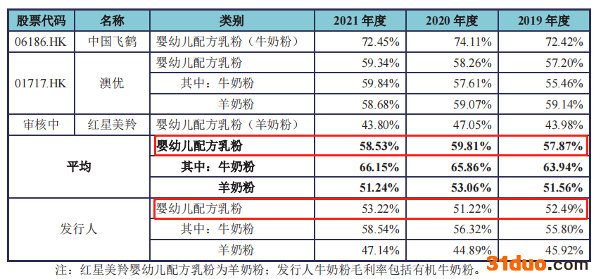 对此,美庐生物表示,“公司婴幼儿配方乳粉毛利率低于同行业公司平均水平,主要系中国飞鹤、澳优为我国婴幼儿配方乳粉行业的龙头企业,企业规模大、规模效应突出,且其产品知名度高、品牌溢价能力强,毛利率较高。公司羊奶粉毛利率2019年、2021年高于红星美羚,2020年低于红星美羚,主要系红星美羚采用湿法工艺,以生鲜羊乳为主要原材料,其采购价格波动导致毛利率波动;而公司以全脂羊奶粉、羊乳清粉为主要原材料,采购价格相对稳定”。