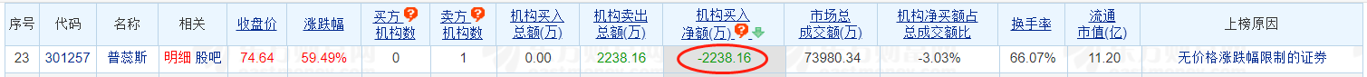 龙虎榜数据显示,卖出普蕊斯金额最大的前五名中,有1家机构专用席位。经统计,普蕊斯的机构席位卖出净额为2238.16万元。