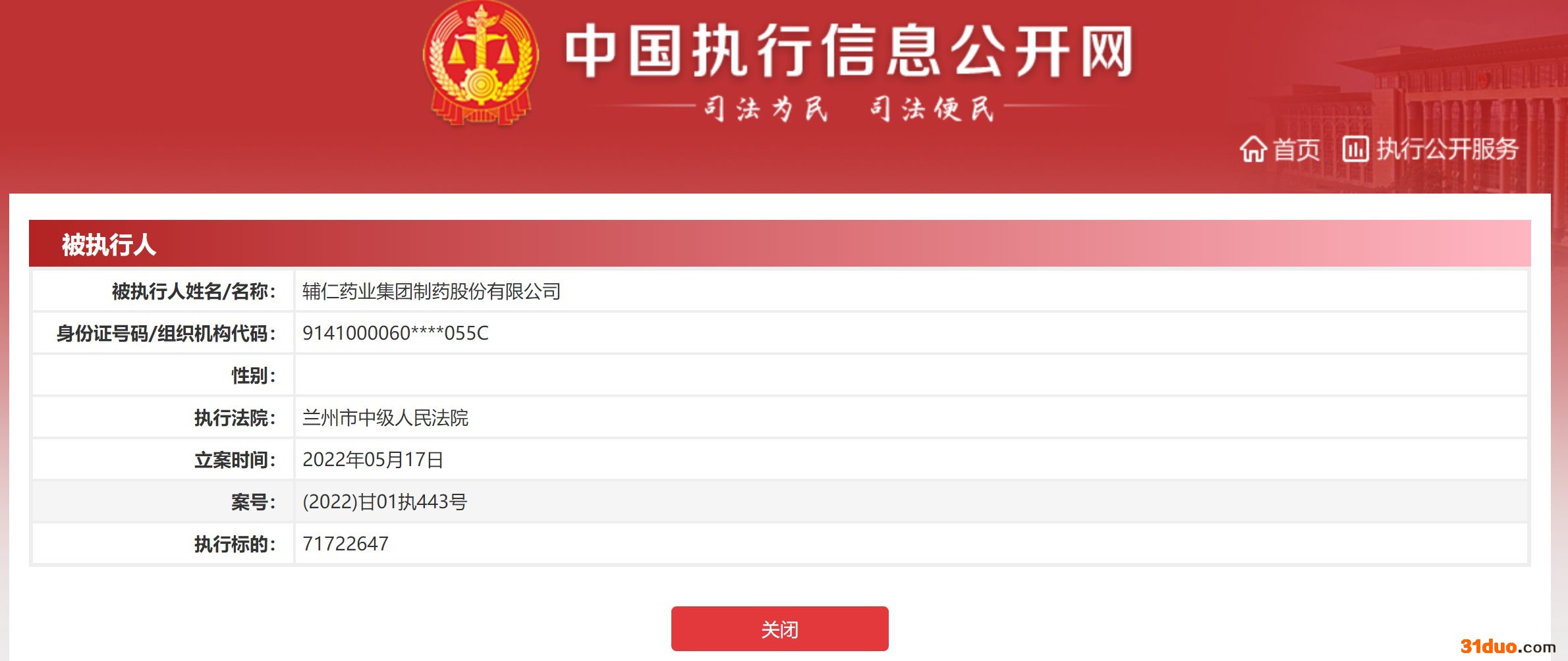 中新经纬5月18日电 中国执行信息公开网信息显示,日前,辅仁药业集团制药股份有限公司(下称“辅仁药业”,证券简称:ST辅仁)新增一条被执行人信息,执行法院为兰州市中级人民法院,执行标的7172.26万,案号为(2022)甘01执443号。
