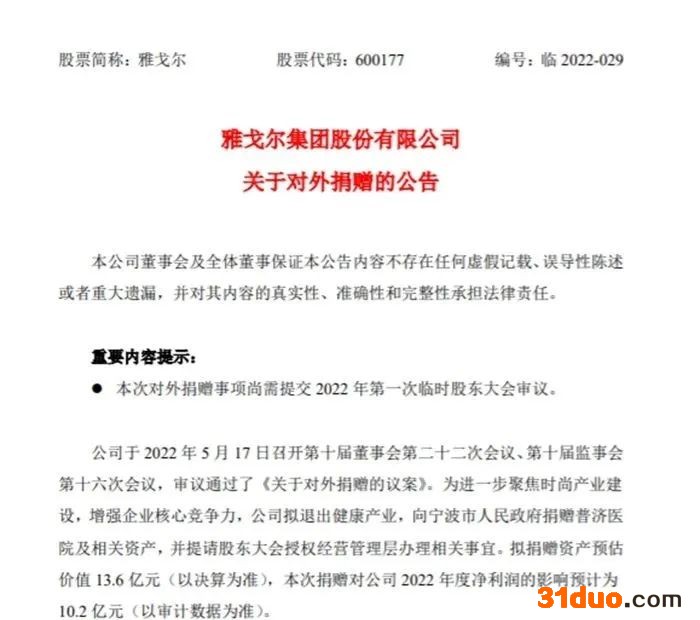 公告显示,雅戈尔于5月17日召开第十届董事会第二十二次会议、第十届监事会第十六次会议,审议通过了《关于对外捐赠的议案》。