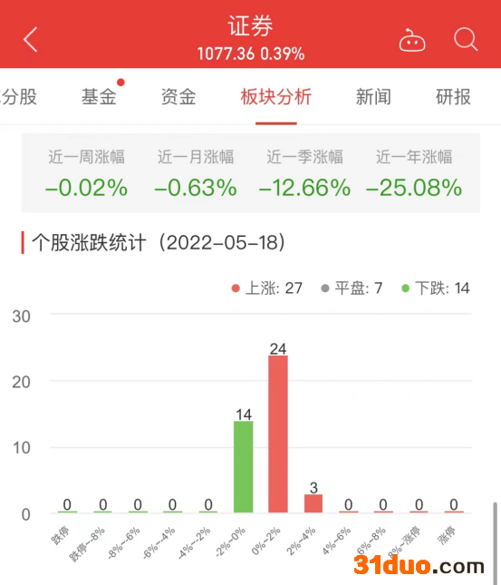 中国经济网北京5月18日讯 今日,证券板块整体涨幅0.39%,其中27只股票上涨,7只股票平盘,14只股票下跌。