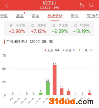中国经济网北京5月18日讯 今日,碳中和板块整体涨幅1.19%,其中84只股票上涨,5只股票平盘,31只股票下跌。