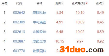 其中,荣联科技、中利集团、北玻股份、绿茵生态、乾景园林位列板块涨幅前五位,涨幅分别为10.10%、10.09%、10.02%、9.97%、9.94%。