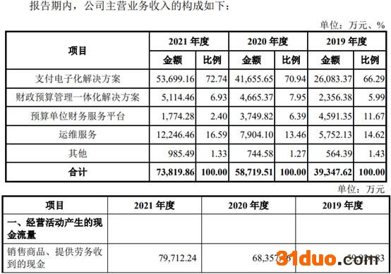 2019年至2021年,中科江南主营业务收入分别为39,347.62万元、58,719.51万元、73,819.86万元,销售商品、提供劳务收到的现金分别为59,924.83万元、68,357.46万元、79,712.24万元。