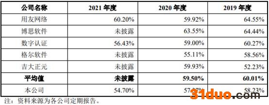 中科江南综合毛利率低且降,数据显示,中科江南综合毛利率逐年下降,且2019年、2020年综合毛利率均低于可比公司均值。2019年至2021年,中科江南综合毛利率分别为58.23%、57.37%、54.70%,2019年、2020年,可比上市公司毛利率均值分别为60.01%、59.50%。