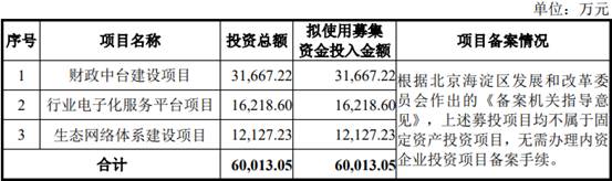 中科江南2022年5月12日在深交所披露的招股书显示,公司拟募集资金6.00亿元,分别用于财政中台建设项目、行业电子化服务平台项目、生态网络体系建设项目。