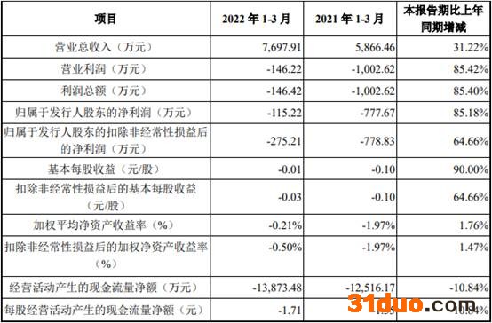 2022年1-3月,中科江南营业总收入为7,697.91万元,同比增长31.22%;归属于发行人股东的净利润为-115.22万元,上年同期为-777.67万元;归属于发行人股东的扣除非经常性损益后的净利润为-275.21万元,上年同期为-778.83万元;经营活动产生的现金流量净额为-13,873.48万元,上年同期为-12,516.17万元。