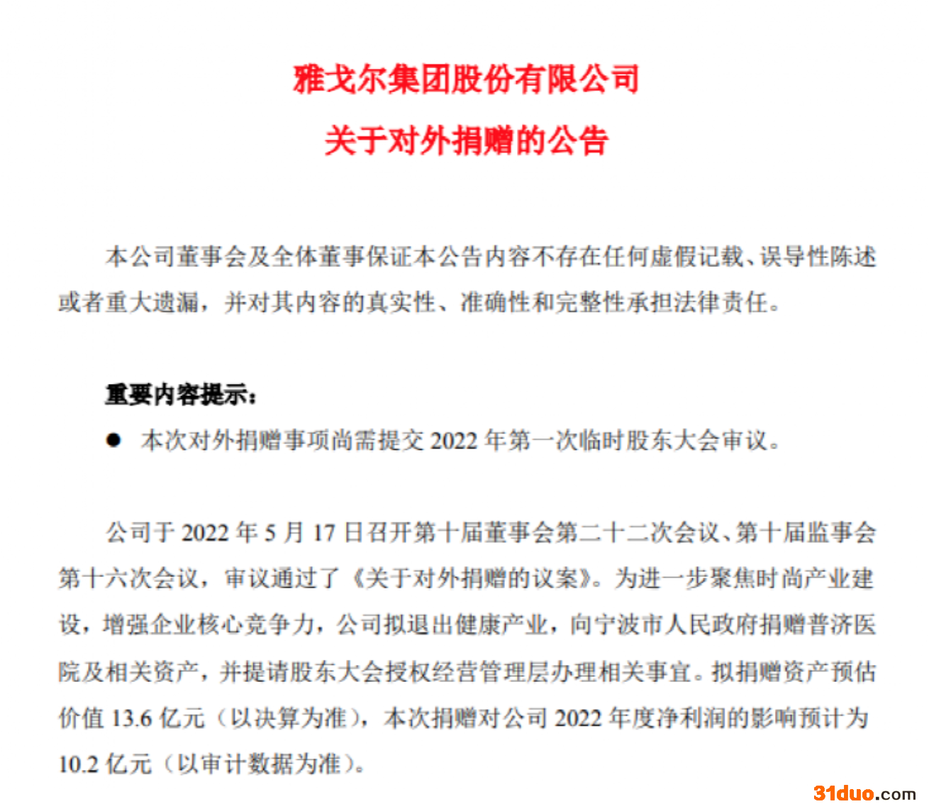 5月17日晚间,雅戈尔发布公告称,为进一步聚焦时尚产业建设,增强企业核心竞争力,公司拟退出健康产业,向宁波市人民政府捐赠普济医院及相关资产。拟捐赠资产预估价值13.6亿元,本次捐赠对公司2022年度净利润的影响预计为10.2亿元。
