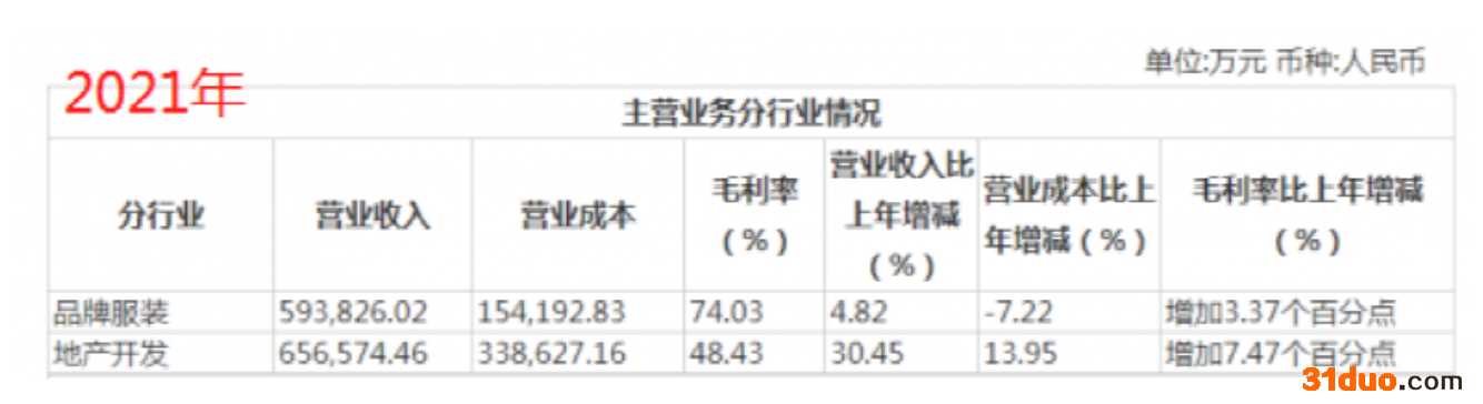2021年财报数据显示,报告期内,雅戈尔完成营业收入136.07亿元,同比增长18.57%;净利润51.27亿元,同比下降29.15%;扣非净利润为44.44亿元,同比增长41.34%。其中,品牌服装实现营收为59.38亿元,同比增长4.82%;地产开发实现营收65.66亿元,同比增长48.43%;投资板块出现下降,实现净利润为18.42亿元,同比下降60.43%。