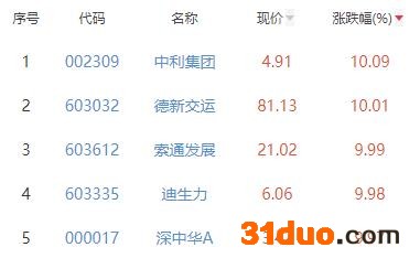 其中,中利集团、德新交运、索通发展、迪生力、深中华A位列板块涨幅前五位,涨幅分别为10.09%、10.01%、9.99%、9.98%、9.97%。