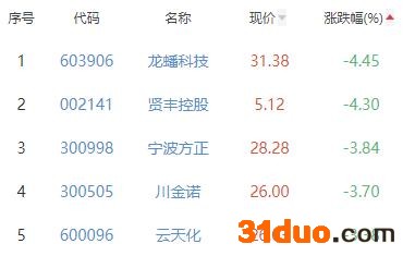龙蟠科技、贤丰控股、宁波方正、川金诺、云天化位列涨幅榜后五位,涨幅分别为-4.45%、-4.30%、-3.84%、-3.70%、-3.38%。