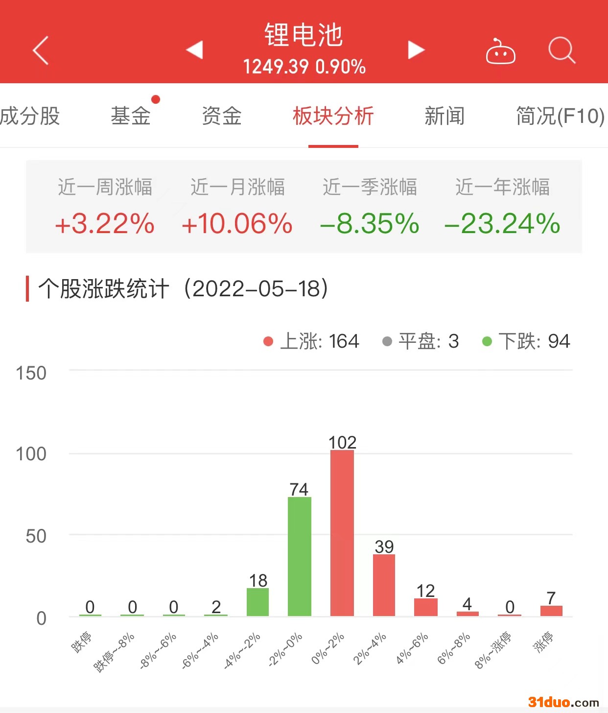 中国经济网北京5月18日讯 今日,锂电池板块整体涨幅0.90%,其中164只股票上涨,3只股票平盘,94只股票下跌。