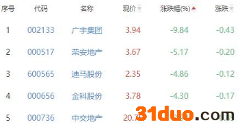 广宇集团、荣安地产、迪马股份、金科股份、中交地产位列涨幅榜后五位,涨幅分别为-9.84%、-5.17%、-4.86%、-4.30%和-3.94%。