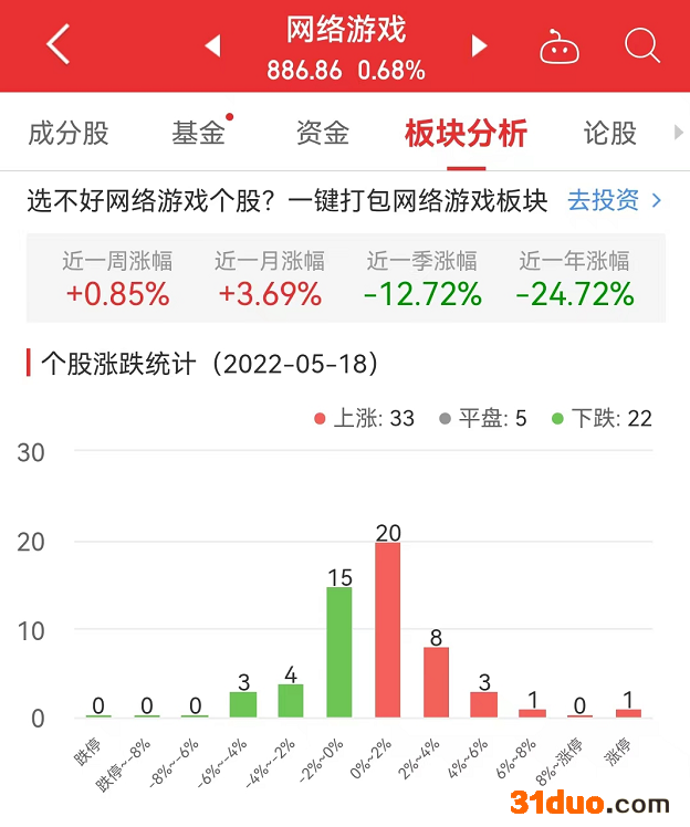 中国经济网北京5月18日讯 今日,网络游戏板块整体涨幅0.68%,其中33只股票上涨,5只股票平盘,22只股票下跌。