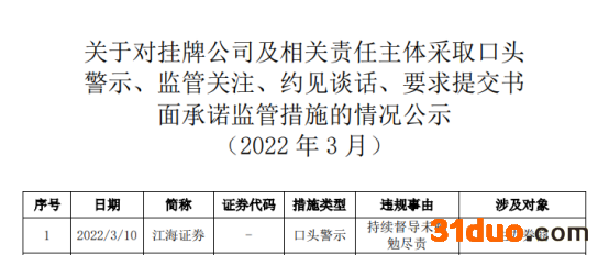 今年4月,全国股转公司公示了关于对挂牌公司及相关责任主体采取口头警示、监管关注、约见谈话、要求提交书面承诺监管措施的情况。其中,江海证券3月因持续督导未勤勉尽责,被口头警示。
