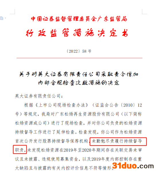 广东证监局指出,其在对广东松炀再生资源股份有限公司(下称“松炀资源”)进行现场检查时,对英大证券持续督导工作进行了延伸检查。经查,英大证券作为松炀资源首次公开发行股票持续督导保荐机构,未勤勉尽责履行持续督导职责,违反了《证券发行上市保荐业务管理办法》相关规定,根据《证券发行上市保荐业务管理办法》相关规定,该局决定对英大证券采取责令增加内部合规检查次数的监管措施。