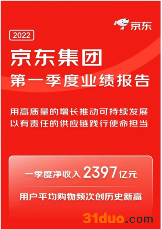 北京时间5月17日,京东集团发布了2022年第一季度业绩。2022年第一季度,京东集团净收入为2,397亿元人民币(约378亿美元),同比增长18.0%。截至2022年3月31日,京东集团过去12个月的活跃购买用户数达到5.805亿,在用户规模稳步扩大的同时,用户的质量显著提升,京东持续赢得用户信赖。