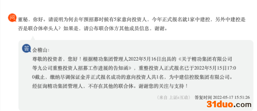 根据会稽山昨日晚间发布的公告,5月16日,公司收到精功集团管理人发来的《关于精功集团等九公司重整投资人招募工作进展的告知函》,其主要内容如下:精功集团等九公司重整投资人正式报名已于5月15日17点截止,缴纳尽调保证金并正式报名成功的意向投资人共1名,为中建信控股。