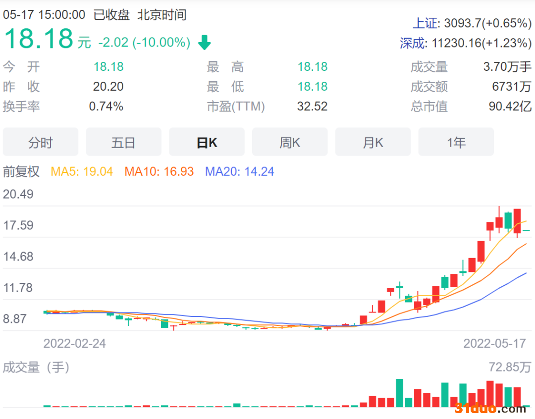 5月17日,会稽山开盘跌停,最终报收18.18元/股,跌幅10.00%。