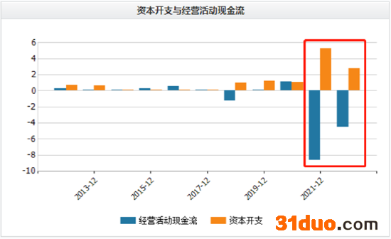 新技术需要大量短时期内看不到产出的投入,这对中科电气而言,无疑是一份额外的负担。2021年和今年一季度,中科电气资本开支剧烈增加,经营现金流却呈现大幅净流出,资金压力不言而喻。