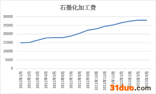 2021年至今,石墨化委外加工费从15000元/吨,逐步攀升至28000元/吨,长协价格也已涨至超过25000元/吨。
