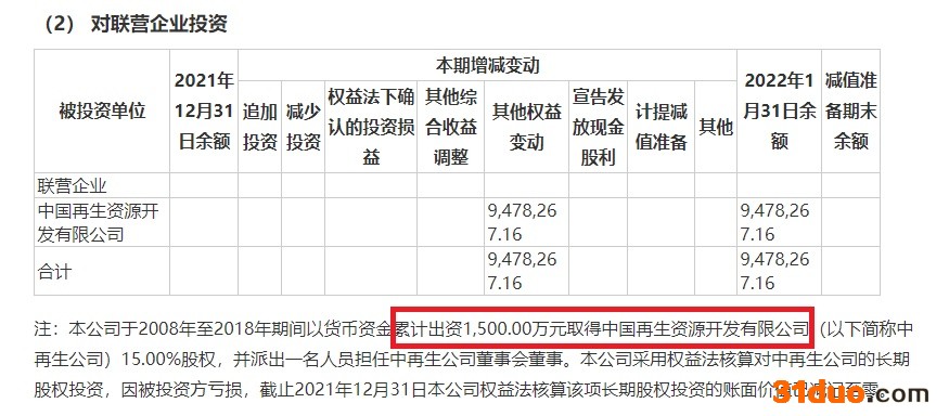 此外,标的公司的净资产在一个月内突增230倍。2021年末、2022年1月末,标的公司净资产分别为4.12万元、951.89万元,2021年末标的公司净资产少的原因是对中再生公司的长期股权投资,因被投资方亏损,长期股权投资的账面价值已减记至零。2022年1月,标的公司增资,实收资本由1亿元增资至1.55亿元,评估增值也就是上文提到的24.4亿元,标的公司的长期股权投资账面价值“被动”升至947.83万元。