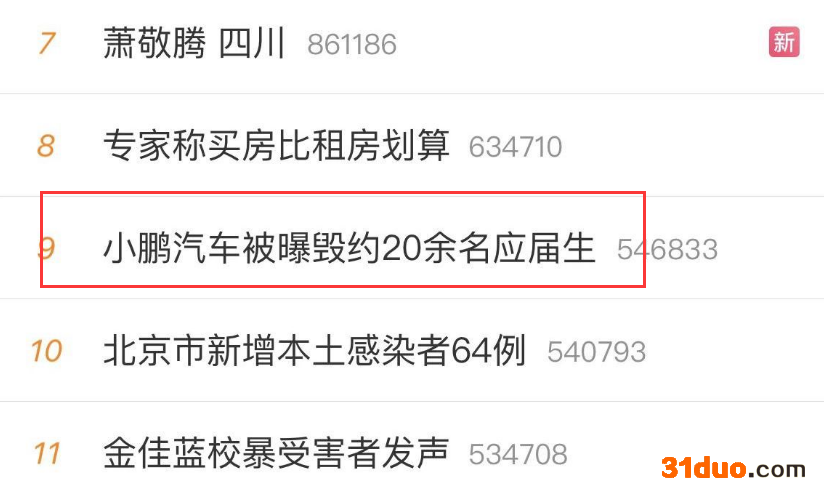 5月19日,在理想汽车被曝出毁约校招生之后,小鹏汽车也被曝出了同样的情况。目前“小鹏汽车被曝毁约20余名应届生”的话题已经冲上了微博热搜榜。
