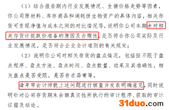深交所要求公司说明六大问题,包括是否存在流动性风险、贸易和屠宰等业务收入暴增数倍的原因、大额关联采购的合理性、猪价大跌却未对存货计提跌价准备的原因及合理性、固定资产等未计提减值准备的原因及合理性等。对上述部分问题,深交所要求审计机构中兴华会计师事务所(特殊普通合伙)发表明确意见。